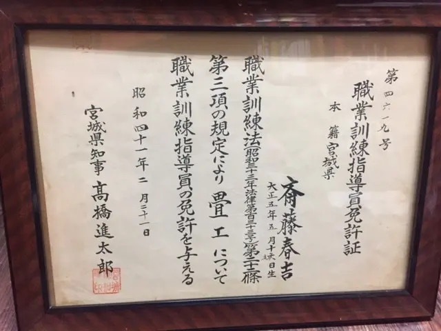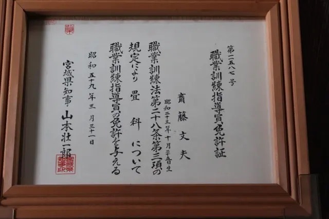 | 従業員 | 二代目 / 齋藤文夫 昭和41年~勤務 三代目 / 齋藤直人 平成9年~勤務 南陽高等技能専門校・畳科卒業(2000年4月~2001年3月) 宮城県建設技能者訓練協会高等職業訓練校・表具科卒業(2016年3月〜2019年3月) 石川県金沢職人大学校・本科畳科(2023年10月〜在学中) |