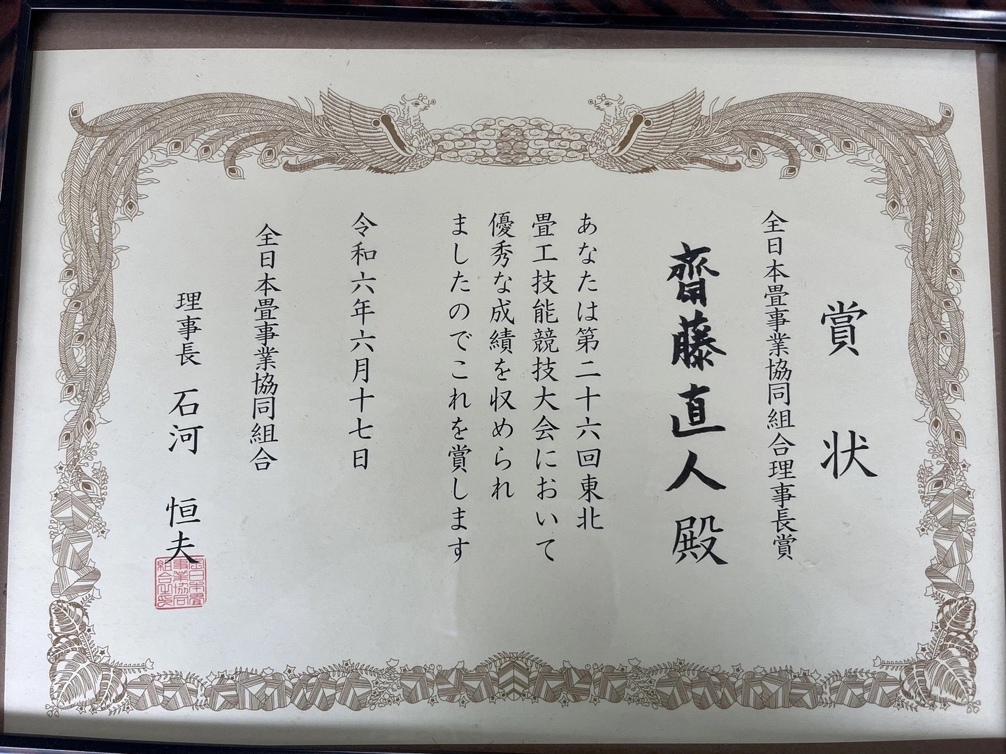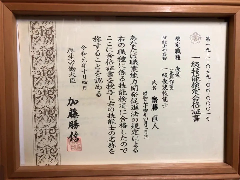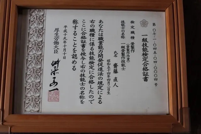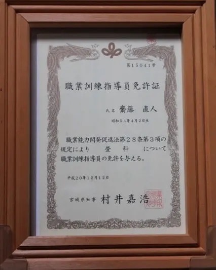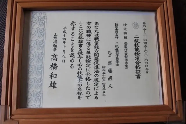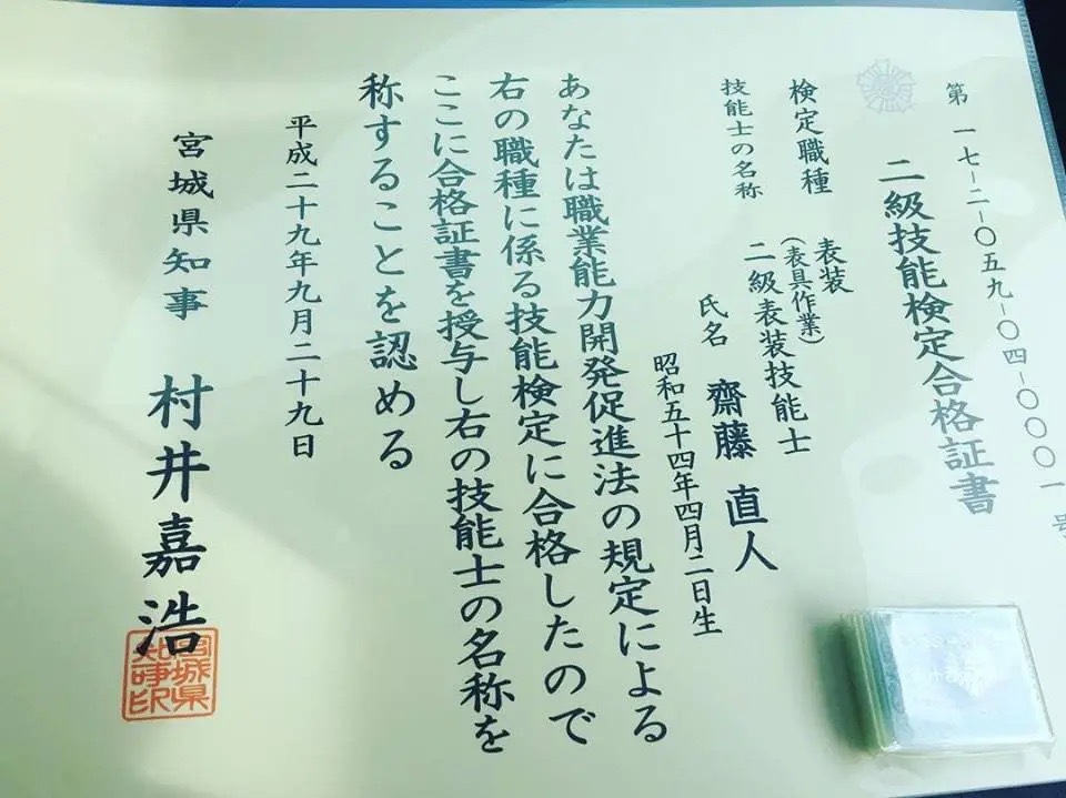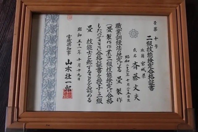 | 資格等 | 第26回東北畳工技能競技大会・全日本畳事業共同組合理事長賞🥈 石川県金沢職人大学校・本科畳科(文化財畳、寺社仏閣畳製作技能) 一級畳製作技能士・第07-1-045-04-0004号 一級表装技能士(表具)・第19-1-059-04-0001号 職業訓練指導員・畳科 品質管理責任者資格証 |